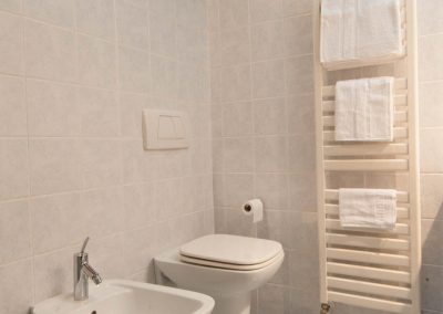 Il bagno con doccia, scalda salviette e asciuga capelli.